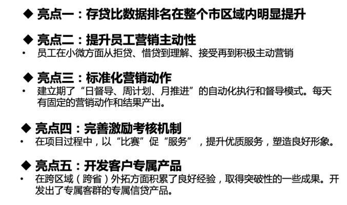 通過1天覆蓋式培訓(xùn)+現(xiàn)場(chǎng)流程導(dǎo)入的模式,極大的提升了該行客戶經(jīng)理?xiàng)l線的戰(zhàn)斗力,強(qiáng)化了重點(diǎn)崗位的整村授信理念與崗位履職意識(shí)。