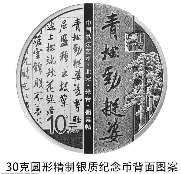 30克圓形銀質(zhì)紀(jì)念幣背面圖案為北宋米芾書《蜀素帖》局部文字及“青松勁挺姿”字樣與松樹、“中國(guó)書法藝術(shù)”篆刻鈐印等組合設(shè)計(jì),并刊“中國(guó)書法藝術(shù)·北宋·米芾·蜀素帖”字樣及面額。