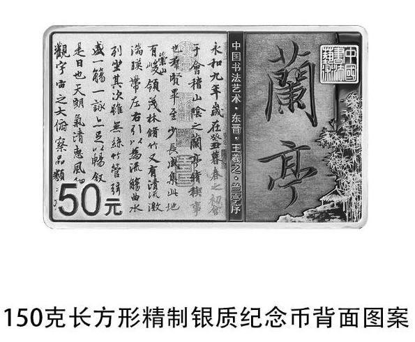 150克長(zhǎng)方形銀質(zhì)紀(jì)念幣背面圖案為東晉王羲之書《蘭亭序》局部文字及“蘭亭”字樣與竹林、亭子、“中國(guó)書法藝術(shù)”篆刻鈐印等組合設(shè)計(jì),并刊“中國(guó)書法藝術(shù)·東晉·王羲之·蘭亭序”字樣及面額。