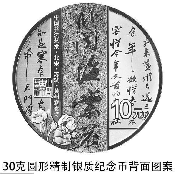30克圓形銀質(zhì)紀(jì)念幣背面圖案為北宋蘇軾書《黃州寒食詩(shī)》局部文字及“臥聞海棠花”字樣與海棠花、“中國(guó)書法藝術(shù)”篆刻鈐印等組合設(shè)計(jì),并刊“中國(guó)書法藝術(shù)·北宋·蘇軾·黃州寒食詩(shī)”字樣及面額。