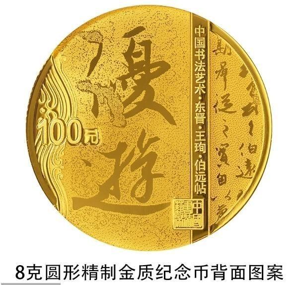 8克圓形金質(zhì)紀(jì)念幣背面圖案為東晉王珣書《伯遠(yuǎn)帖》局部文字及“優(yōu)游”字樣與裝飾紋樣、“中國(guó)書法藝術(shù)”篆刻鈐印等組合設(shè)計(jì),并刊“中國(guó)書法藝術(shù)·東晉·王珣·伯遠(yuǎn)帖”字樣及面額。