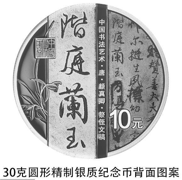 30克圓形銀質(zhì)紀(jì)念幣背面圖案為唐代顏真卿書《祭侄文稿》局部文字及“階庭蘭玉”字樣與蘭花、“中國(guó)書法藝術(shù)”篆刻鈐印等組合設(shè)計(jì),并刊“中國(guó)書法藝術(shù)·唐·顏真卿·祭侄文稿”字樣及面額。