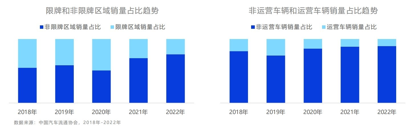 從市場驅(qū)動力來看,新能源汽車產(chǎn)業(yè)發(fā)展驅(qū)動力正逐漸由“政策主導(dǎo)”轉(zhuǎn)向“市場主導(dǎo)”和“用戶主導(dǎo)”,新能源車市場需求開始大量釋放。近5年數(shù)據(jù)顯示,從限購城市分布來看,七個汽車限購城市新能源汽車銷量占比呈降低趨勢,而非限購城市銷量占比則逐漸提升,非限牌區(qū)域新能源車占比穩(wěn)步增長,已由2018年55.4%增長至2022年75.5%。用戶主動購買意愿提升明顯。并且,C端消費市場也在不斷崛起(2019年主機廠向B端市場大量拋售,以抓住新能源財政補貼退坡前最后紅利,導(dǎo)致C端消費市場份額出現(xiàn)短暫的萎縮),2022年占比達88.6%,相比2018年提升了8個百分點。