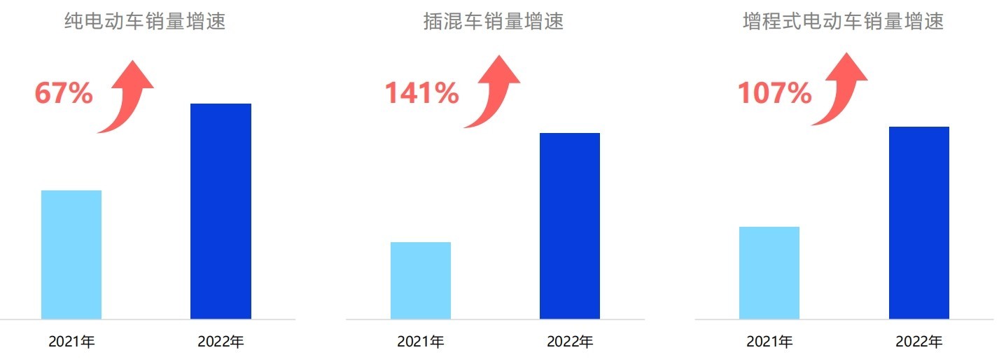 新能源汽車的爆發(fā)是插混車型和增程式電動車的爆發(fā)從新能源車分類來看,2022年純電動車銷量依舊保持高速增長,而插混車型和增程式電動車則出現(xiàn)超過一倍的爆發(fā)式增長。隨著車型的豐富和成熟,用戶的選擇更為多元化。