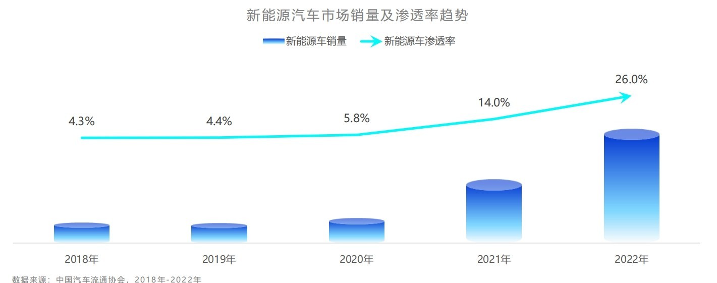 疫情以來,新能源汽車率先恢復(fù)增長,不僅銷量創(chuàng)造了新高,在乘用車中的銷量占比也有了新的突破,為整個乘用車市場的復(fù)蘇作出了重要貢獻。過去的2022年,新能源汽車市場大放異彩,在政策和市場的雙引擎驅(qū)動下,市場增長遠超預(yù)期,滲透率屢創(chuàng)新高,全年滲透率接近26%,較去年提升12個百分點,提前實現(xiàn)了國務(wù)院發(fā)布的《新能源汽車產(chǎn)業(yè)發(fā)展規(guī)劃(2021-2035) 》中關(guān)于2025年新能源達到汽車銷量20%的目標。